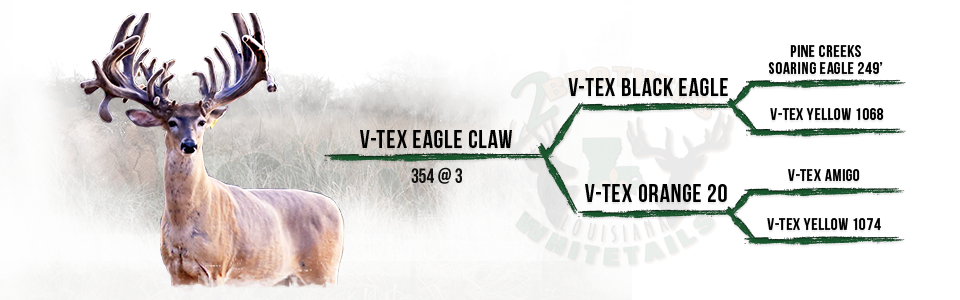 V-Tex Eagle Claw at 3 scored 354 , at 2 scored 290, at 1 years old scored 200 and he has proven to be an AWESOME SIRE. His yearling bucks this year were 100% all outstanding. He is among our most proven producers. Eagle Claw has sired multiple yearlings over 200, and as you will see extremely consistently @ 160, 180, 210, 200, 230, 233, 185 and a few others around 150. This year the result was amazing with his 2 year olds @422 V-Tex Eagle, EC2 289, TKS bucks 260s, Mighty Fine 268, Mr Clean 200 perfectly clean 6×6 just to mention a few. Hitting these numbers is a great accomplishment in breeding 3/4 Texas does with a 3/4 or so Texas buck. We have yet to see what he could do in a full northern doe. He is half owned by Vtex Whitetails.
