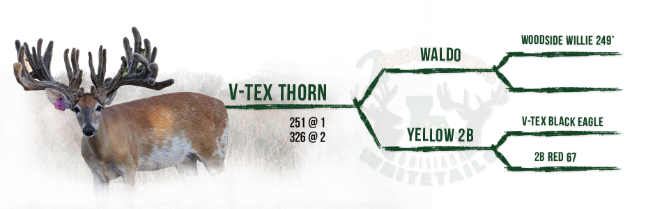 V-Tex Thorn at 1 scored 251 WOW on Texas soil, at 2 he scored 326, and at 3 scored 360. He is a stand-out buck for sure and may be the largest piebald deer ever born. This year we were able to see his first round of offspring and they were outstanding.