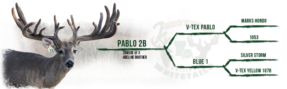 Pablo 2b was 28 inches wide this year @3. If you want to add width and tine length, this deer has it. He is a brother to Abilene who was 38-40 inches wide and shared the same sire. Pablo, his sire, is a Texas producer of countless wide typical with extra long tines.